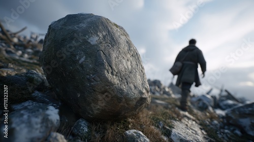A large rock in sharp focus dominates the foreground as a solitary person walks away across a rocky, rugged landscape under a cloudy sky