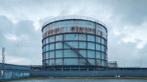 large, rust-eaten, empty, tank, industrial, zone, sky, overcast, gloomy, atmosphere, oil, factory, steel, storage, gas, plant, construction, chemical, energy, container, tower, metal, fuel, crude oil, liquid