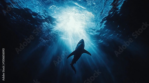 ocean, shark, water, underwater, blue, sunlight, ray, depth, silhouette, predator, marin, animal, fin, dark, wave, surface, swimming, light, environment, aquatic, wild, nature, danger, fear, powerful, serene, dramatic, bottom, upward, explore, journey, travel, freedom, movement, calm, peaceful, contrast, mystery, shadow, unseen, below, up high, natural, perspective