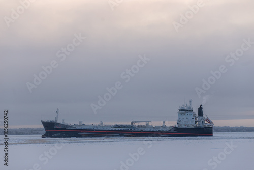 A large ship is peacefully floating on the water on a cloudy day, making for an interesting sight against the overcast sky