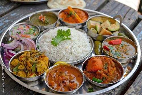 lunch, food, dinner, plate, indian, vegetable, vegetarian, rice, dal, bowl, masala, gobi, meal, north, sweet, widener, healthy, platter, asian, tray, cauliflower, steel, potato, dish, basmati, cheese, pickle, menu, fries, round, dessert, butter