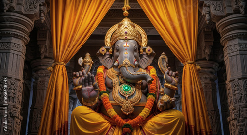 large, statue, lord, ganesh, sitting, between, gold, curtain, temple, intricate, carving, vibrant, orange, garland, mythology, wisdom, symbolic, serenity, spiritual, god, ornate, peace, faith, devotion, elephant, prosperity, success, pagan, worship, head, ritual, hindu, idol, tusk, religion, ceremony, india, art, oriental, trunk, decorative, sculpture, remover, culture, asian, architecture, traditional, stone, obstacle