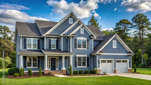A large two story blue gray house with wood and vinyl siding stands proudly in a serene landscape, outdoor scenery, blue gray house