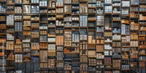 A large warehouse with numerous items. Rows of shelves with boxes. Logistics. Inventory control, order fulfillment or space optimization