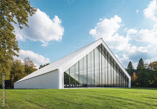 large, white, building, glasses, roof, window, lush, green, field, architecture, modern, blue, sky, facades, exterior, landmark, light, design, business, structure, landscape, new, famous, commercial, city, tour tourism, beautiful, tree, travel, park, background, nature, construction, destination, entrance, door, lawn, art, industry, grass, garden, urban, property, outside, perspective, place, grey, museum