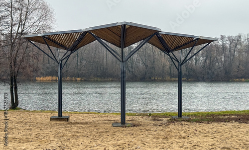 large, wooden, structure, black, top, sitting, sandy, park, beach, tree, body, water, nature, lake, travel, landscape, summer, architecture, pavilion, green, sky, outdoors, garden, beautiful, view, city, duck pond, landmark, river, background, gazebo, forest, building, outside, day, arbour, shelter, pergola, relax, tour tourism