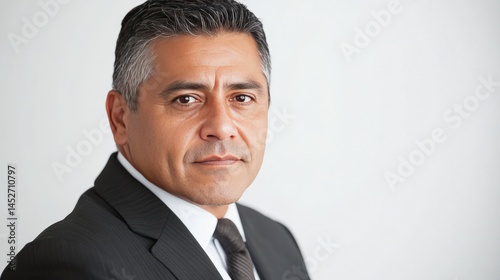 A Latino businessman, a successful boss in a suit, isolated on white. He's a confident entrepreneur and office manager. Plenty of room to add your own text.