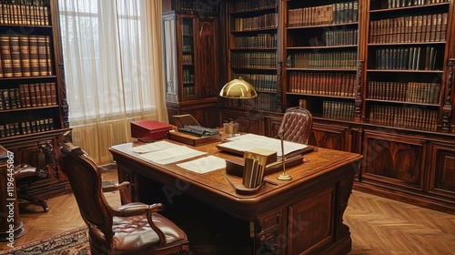 office, large, wooden, desk, filled, legal, paper, room, interior, chair, table, furniture, home, design, book, wood, library, shelf, house, chair, eatery, study, nobody, bookshelf, dining, book, decor, empty, luxury