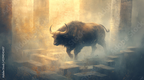 mythical, creature, labyrinth, bull, legendary, prowling, labyrinth, fantasy, fog, atmosphere, shadow, ancient, mystery, artwork, powerful, eerie, haunting, captivating, symbolism, enchanting, surreal, beast, stone, darkness, adventure, moody, desert, exploration, depth, serene, magical, mysterious, character, striking, ambience, narrative, tension