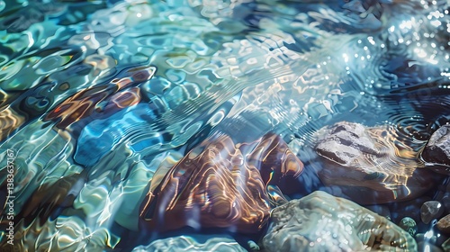 A light aquamarine water, bunch of colourful gemstone lying under a stream, dynamic water flowing, transparent light blue water, Generative AI illustrations.