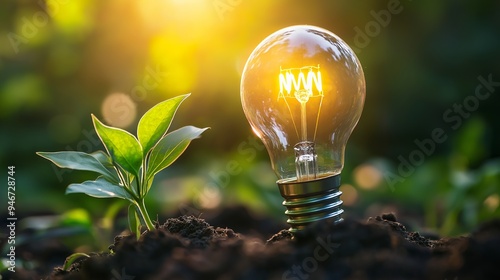 A light bulb emerges from soil beside a young plant, symbolizing growth and sustainability.