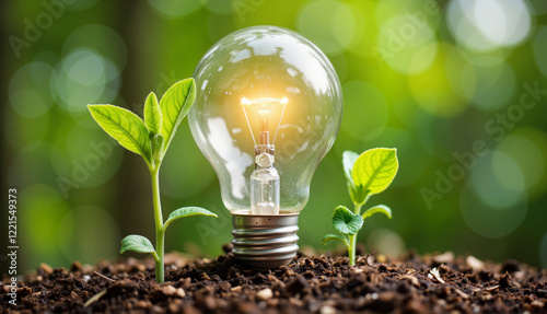 A light bulb in the soil with green plants in nature symbolizing energy