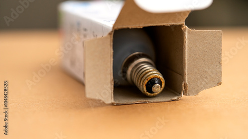 A light bulb is sitting in an open box. The bulb is black and the box is brown