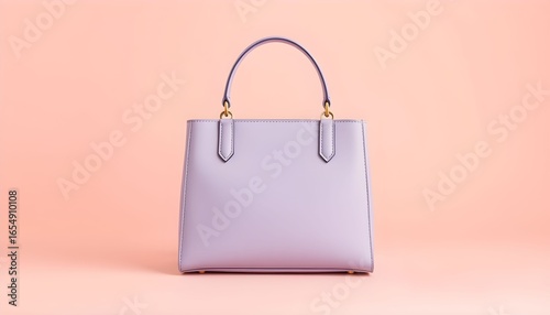 A light purple leather handbag, featuring simple design elements, presented against a pastel pink background.