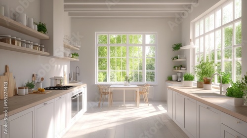 A light Scandinavian kitchen with minimalist white furniture and natural wood countertops bathed in soft daylight from large windows creating an open and airy feel