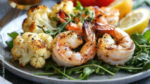 light, filling, lunch, plate, grilled, shrimp, rocket, leaf, side, roasted, cauliflower, food, meal, chicken, salad, seafood, meat, dinner, dish, epicure, cookery, sauce, fish, tomatoes, delicious, healthy, vegetable, fresh, fried, white, prawn