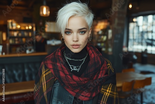 lightweight, shawl, wrapped, around, model, shoulder, standing, in, modern, interior, soft, studio, lighting