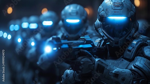 soldier, armoring, technology, weapon, blue, futuristic, science fiction, military, light, combat, line, sharpened, tension, action, design, equipment, protection, strategy, intensity, scene, environment, shadow, detail, realism, stance, readiness, atmosphere, power, vision, innovation, cinematic, narrative, conflict, precision, teamwork, elite, advanced, menacing, uniform, challenge, mission, aesthetic, dynamic, structure, response, threat