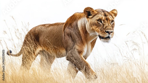 A lioness walking through the tall grass, hunting,on white background.