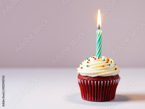 A lit candle on top of a red velvet birthday cupcake with cream cheese frosting, dessert decoration, cream cheese frosting, party favor