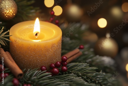 candle, lit, flames, wax, yellow, gold, glistering, holiday, christmas, festive, ornament, bauble, evergreen, pine, tree branch, sprig, red, berry, holly, cinnamon, stick, brown, bokeh, light, blur, background, warm, cosy, winter, season, celebration, ambience, sparkle, shine