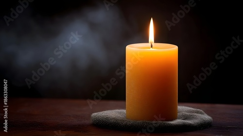 A lit orange candle emits a warm glow in the darkness with subtle smoke rising against a dark background