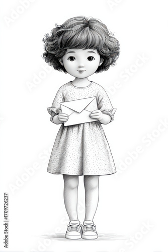 A Little Girl Holding an Envelope: A charming illustration of a young girl, rendered in a simple yet endearing black and white style, cradling a delicate envelope with gentle hands.