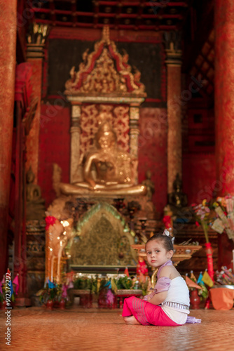 A little girl sits in front of a statue of Buddha. The statue is surrounded by flowers and candles. The girl is wearing a white dress and a pink headband. The scene is peaceful and serene