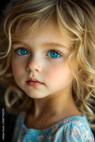 little, girl, blue, eye, looking, camera, children, blond, hair, portrait, closeup, beauty, innocence, youthful, face, portraiture, photo, lighting, soft, sharpened, young, curly, serious, expression, wearing, dress, floral, pattern, styled, loose, curl, background, blurred, making, focal, point, natural, highlighting, racked, out, taken, elevated, angle