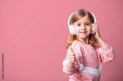 A little girl-blogger listens to music in white headphones, shows a class gesture, distance learning on an isolated background.