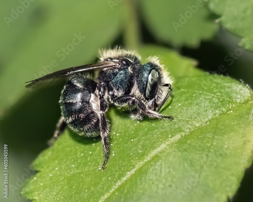 A little hairy blue green Osmia Mason Bee precision cutting and gathering leaf materials to build her nest. Long Island, New York, USA