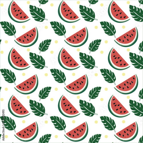 A lively pattern of watermelon slices and green monstera leaves on a white background.