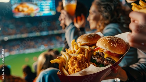 fast food, burger, fries, chicken, fan, lively, scene, food, tray, crowd, event, excitement, game, audience, meal, delicious, snack, enjoyment, spectator, festive, celebration, stadium, hand-held, culinary, athletic, cheering, entertainment, concession, hunger, match, people, tasty, hot dog, treat, ambience, enthusiasm