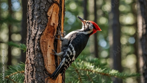 A lively woodpecker with striking black white and red