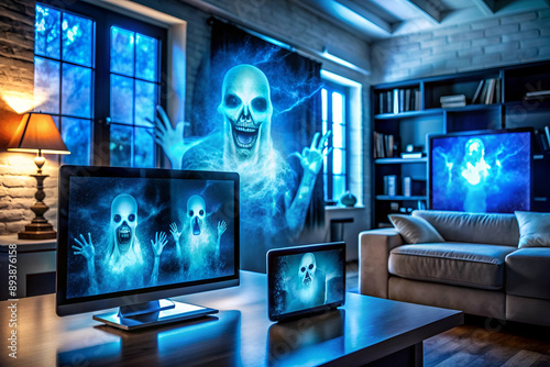 A living room with a television, tablet, and computer monitor displaying a ghostly figure. The room is dimly lit, creating a spooky atmosphere