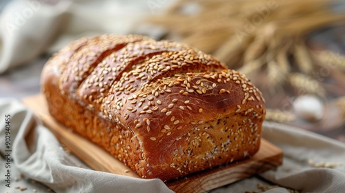 A loaf of bread with sesame seeds on top sits on a wooden cutting board. The bread is brown and has a nutty flavor. The scene is simple and peaceful, with the bread as the main focus