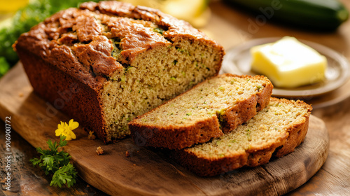 a loaf of homemade zucchini bread, sliced and arranged with a pat of melting butter.