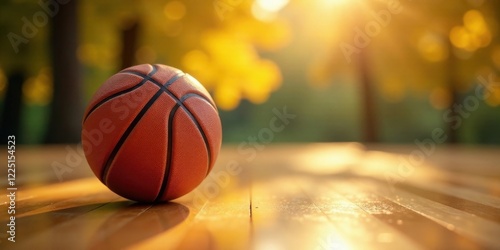 A lone basketball rests on a sunlit wooden surface, autumn foliage softly blurred in the background, creating a peaceful and serene athletic scene.