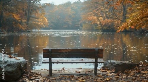 lone, bench, overlook, placid, river, surround, autumn, foliage, leaves, tree, fall, fresh, nature, water, lounge, silence, beauty, quiet, enchant, view, stillness, dawn, leaf, park, lake, landscape, picnic, garden, seat, relax, wood, peaceful, calm, duck pond, tranquil