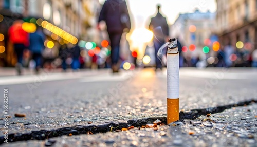 A lone cigarette butt stands upright in a street crack, defiant amid urban blur—symbolizing pollution, neglect, and the quiet persistence of harmful habits in a bustling cityscape.