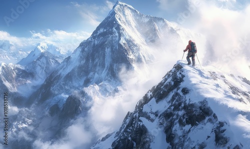 A lone climber conquers a snowy mountain peak.