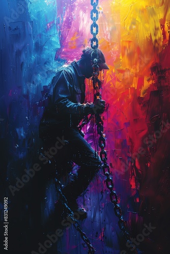 A lone figure climbs a chain against a vibrant, abstract background of blue, purple, and orange. The silhouette evokes a sense of struggle and determination.