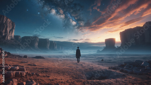 A lone figure gazes at a celestial sky over a serene, otherworldly landscape, inspiring contemplation and a sense of vastness.