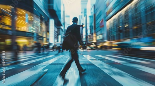 street, city, man, walking, crosswalk, blur, motion, urban, landscape, people, business, suit, rush, hours, traffic, building, fast, moving, speed, dynamic, blue, grey, night, dark, bright, light, modern, contemporary, concrete, asphalt, line, geometric, street light, silhouette, solo, anonymous, background