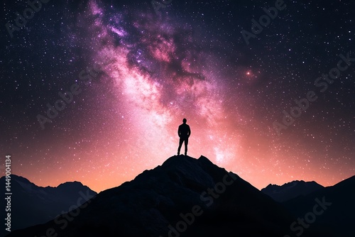 A lone figure silhouetted atop a mountain peak gazing at the breathtaking Milky Way galaxy a vibrant pink and purple