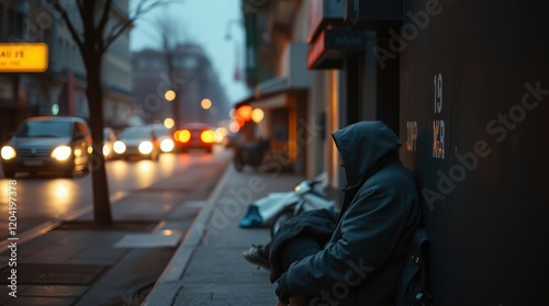 city, street, night, alone, person, wall, sitting, traffic, light, blurry, dark, sidewalk, dusk, melancholic, urban, atmosphere, isolation, cold, lonely, sad, gloomy, shadow, street light, building, evening, vehicle, car, concrete, grey, jacket, hood, head, pose, human, figure, winter