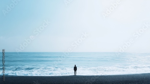 A lone figure stands at the edge of a wide, tranquil blue sea, contemplating infinity under a vast sky, embodying freedom and solitude.