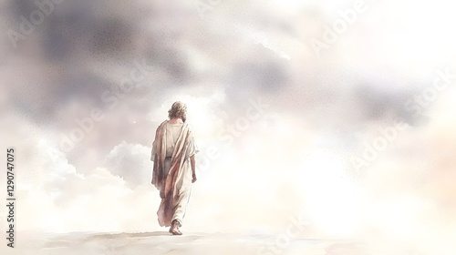A lone figure stands before a vast stormy sky overwhelmed by the raw power and beauty of God s creation depicted in a soft watercolor style The man is dwarfed by the scale of the elements