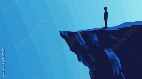 A lone figure stands on the edge of a cliff, silhouetted against a bright blue sky. The scene evokes feelings of risk, solitude, and potential.
