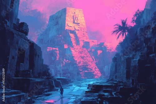 temple, figure, walking, ancient, ruin, stone, architecture, landscape, sky, pink, blue, purple, light, shadow, dusk, evening, mystical, mysterious, surreal, fantasy, silhouette, path, step, stair, doorway, entrance, journey, solitude, exploration, dream, night, imagination, art, painting, digital, illustration, artwork, abstract, style, colours, mood, atmosphere, futuristic, retro, vintage, design
